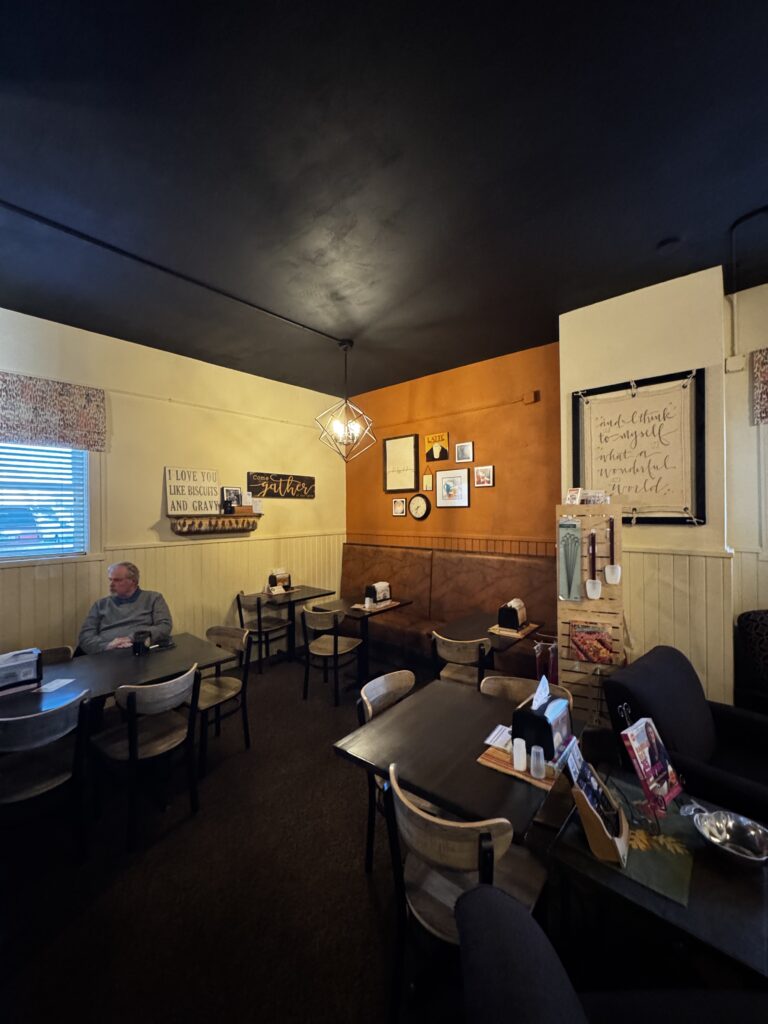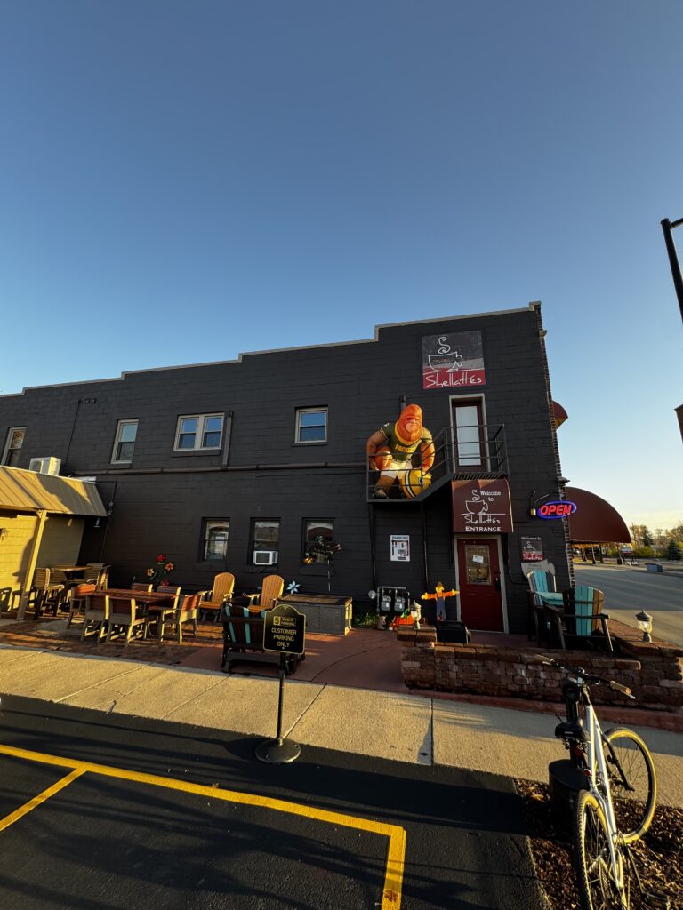 Shellattés in Neenah, WI is a coffee shop and quick-bites restaurant that is borderline bizarre in some areas. Outside has a parking lot, patio with assorted benches, tables, chairs and a few flower beds. There was a large Inflatable Sasquatch in a Packers Jersey. While I am not a sports fan and I could understand the packers jersey… It still remains a mystery to me as to why there was a beast like that above the door.